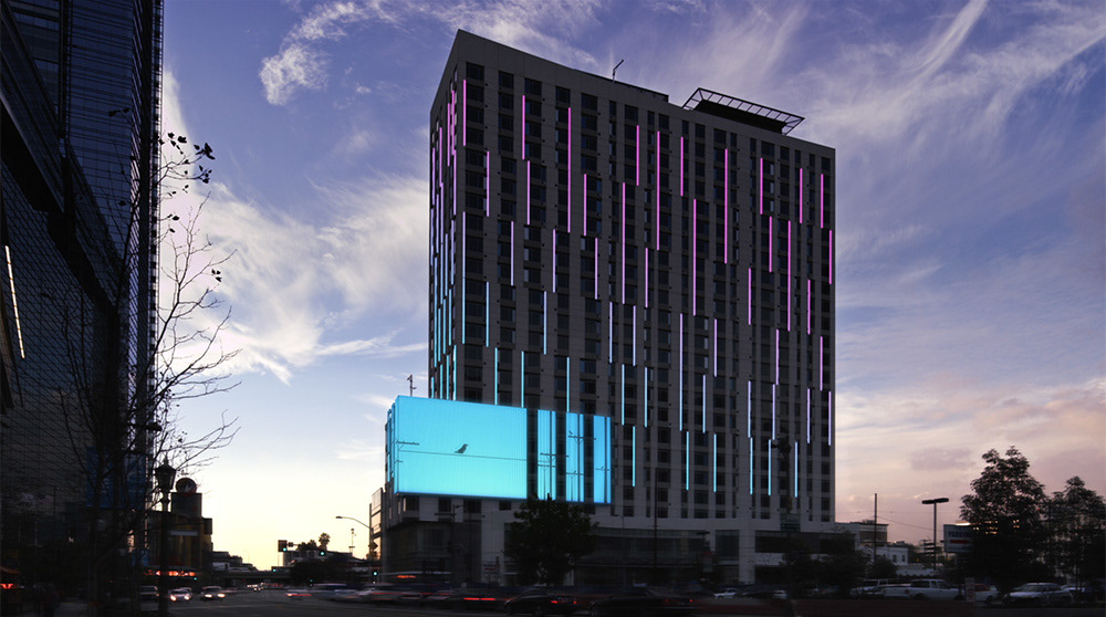 The downtown Marriott installation integrates mix-resolution LED systems - one designed to playback artwork and advertising, and a linear light system that reaches upwards onto the building, integrating with the artwork.  As Art Director, I was included in the project design from the initial screen concepts in 2011 to the final install in 2014.  During that time I assisted in refining the architectural integration of the fixtures and with the creation of original artwork for the screen.  One piece I aided in creating was an homage to Blade Runner, an inspiration driving the project.  The project was implemented by StandardVision, LLC, a company providing solutions for architectural integration of LED displays.